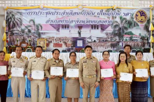 เวลา 13.00 น. นายสมควร ใจซื่อ นายอำเภอท่าบ่อ ดำเนินการมอบเกียรติบัตรผู้สืบสาน ส่งเสริม เอกลักษณ์การแต่งกายผ้าไทย ตามแนวพระดำริ “ผ้าไทยใส่ให้สนุก” ให้แก่ นางศิรประภา จิตตรง รองปลัดองค์การบริหารส่วนตำบลโพนสา และ ดร.คำดี จันทะเกษ นายกองค์การบริหารส่วนตำบลโคกคอน ทั้งนี้ เจ้าหน้าที่พัฒนาชุมชน ได้ชี้แจงข้อราชการเกี่ยวกับการดำเนินงานพัฒนาชุมชนอำเภอท่าบ่อ ในการประชุมหัวหน้าส่วนราชการ ครั้งที่ 9/2568 ดังนี้